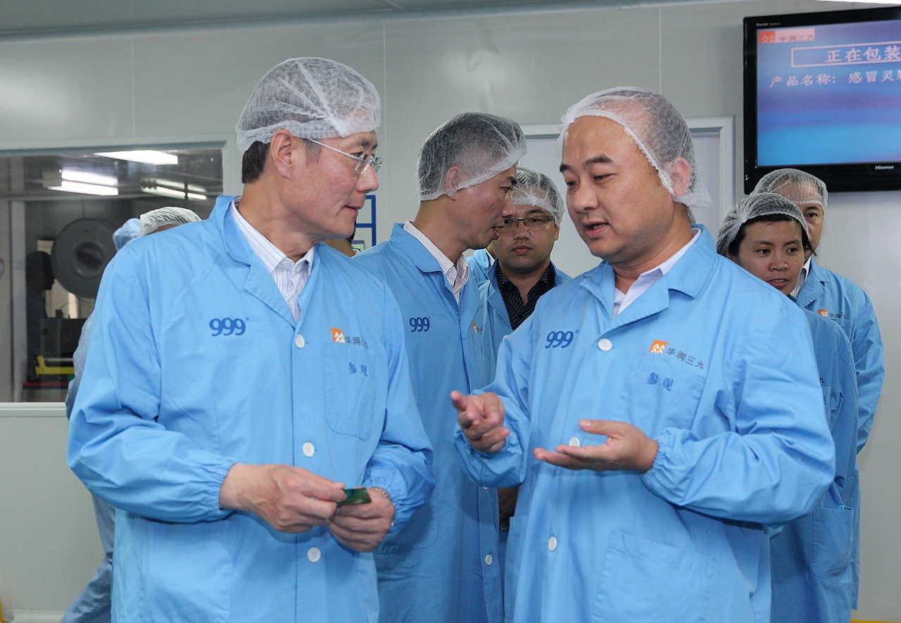 傅育宁董事长首先来到观澜基地参观,深入丸剂、颗粒剂、中药配方颗粒、软膏等车间生产一线,了解药品制造的产能、工艺、流程,以及质量控制等情况,并在物流中心观看了全自动化的高架立体库的操作运行。在制丸间,太阳成集团tyc138总裁宋清介绍说,制丸的全部原辅料都是通过无菌管道输送,以减少药品生产环节的污染。对此,傅董连连点头表示赞同;在5S推进活动看板前,宋清总裁介绍了生产系统深入开展精益管理,取得明显成效的情况。傅董看得十分认真,并给予肯定;在配方颗粒车间,宋清总裁详细介绍了三九中药配方颗粒近年的业务发展及行业情况。傅董对此表现出浓厚的兴趣,询问了中药配方颗粒的原料产地、生产工艺、质量标准以及行业、市场等情况。宋清总裁分别作了解答。