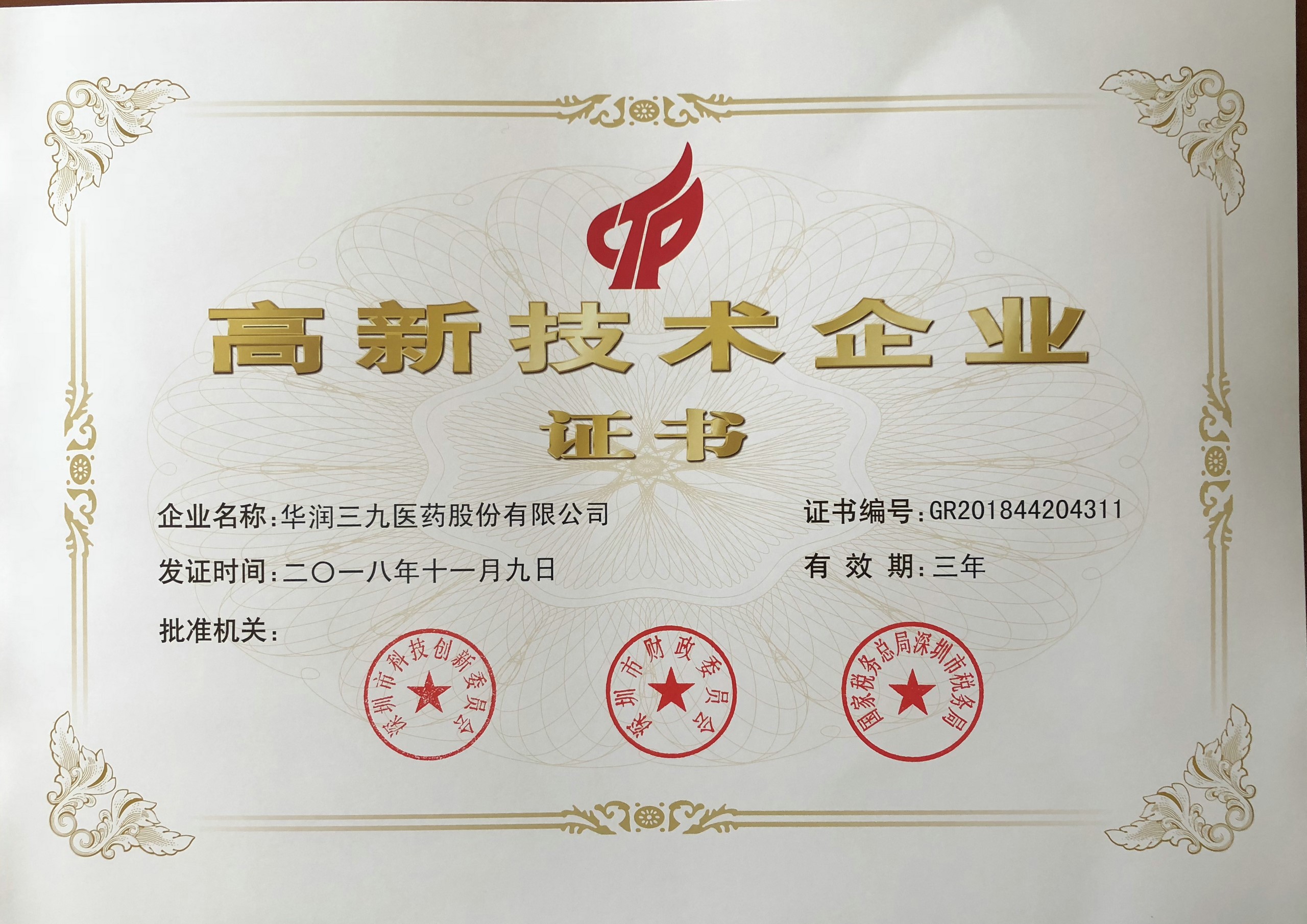 3月14日,太阳成集团tyc138收到深圳市科技创新委员会、深圳市财政委员会、国家税务总局深圳市税务局联合颁发的《高新技术企业证书》(证书编号:GR201844...