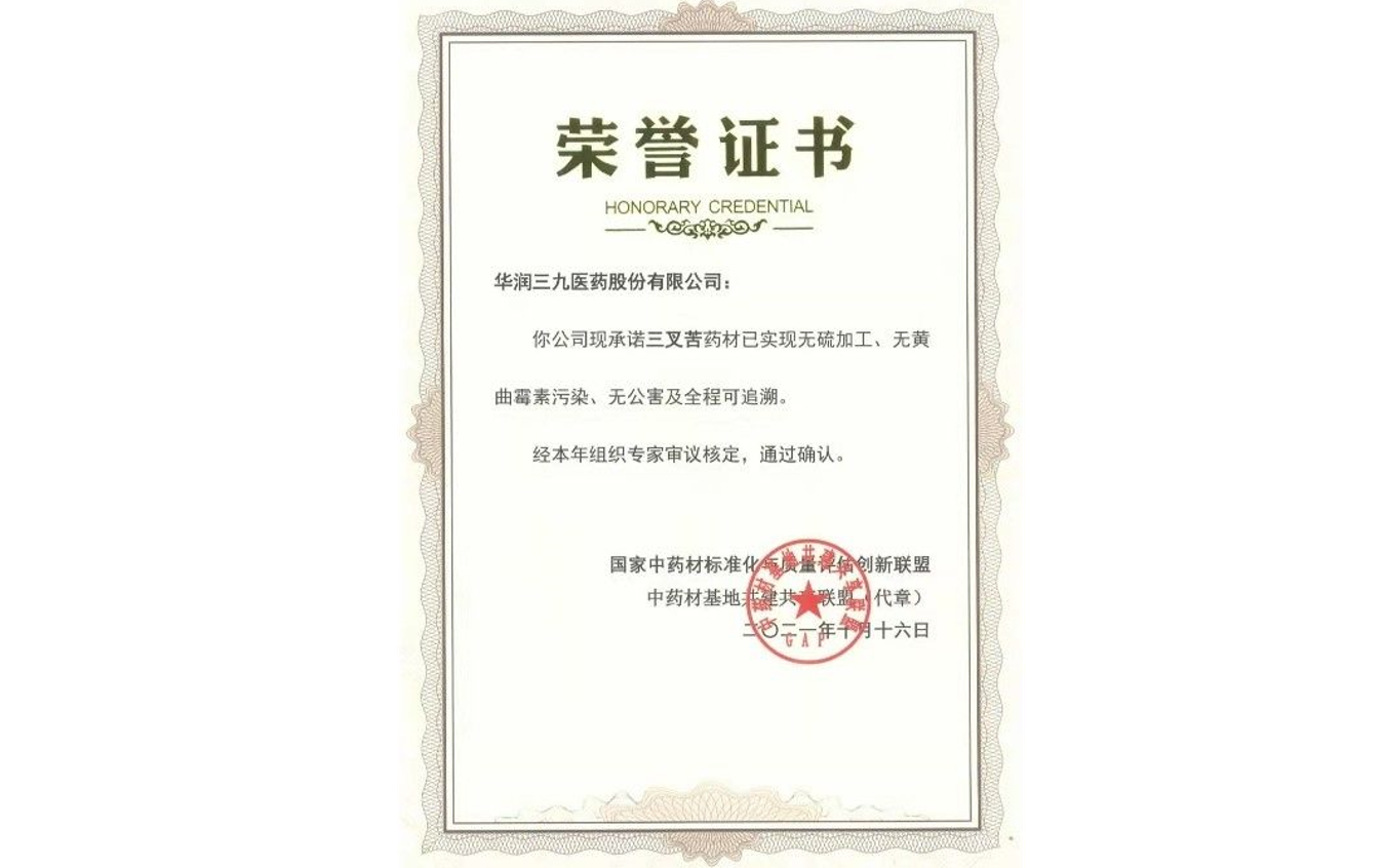 10月16日,在南宁召开的第九届中药材基地共建共享联盟交流大会上,太阳成集团tyc138申报的“三叉苦”药材获评“三无一全”优质药材,并颁授品牌品种证书。“三无一全”证书由国家中药材标准化与质量评估创新联盟颁发,要求在中药材生产过程中实现无硫加工、无黄曲霉素污染、无公害及全程可追溯。