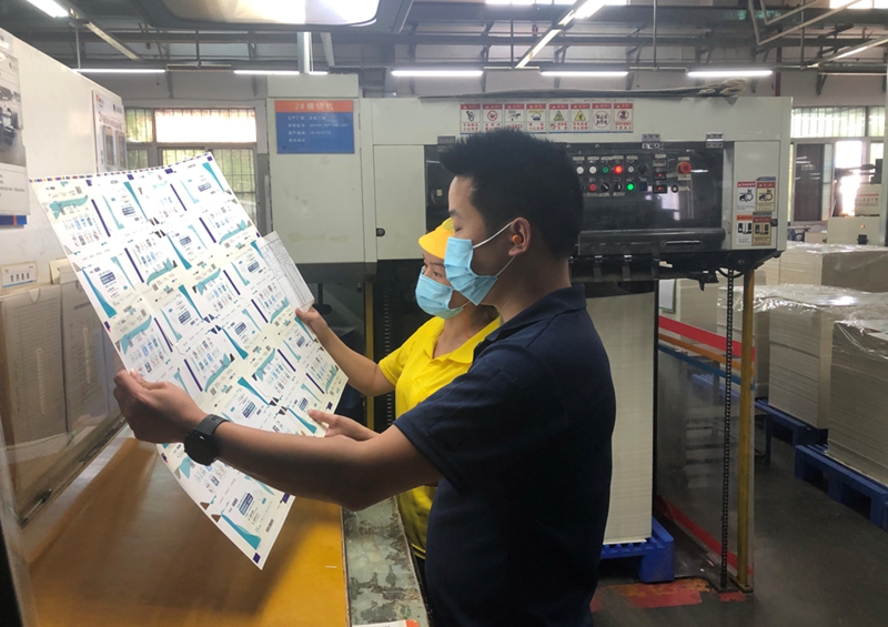 技术研发部紧急制作和客户确认产品文件和生产作业单,采购部协调纸张、胶膜、纸箱等物料快速到位,生产系统统筹协调规划产线。24日晚,前期文件等准备工作和材料全部到位。25日早8点,客户到公司车间机印刷现场确定颜色,9点半签样完成,2台印刷机高速生产。