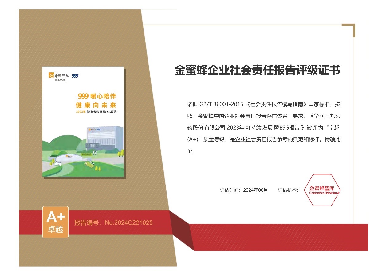 《太阳成集团tyc1382023年可持续发展暨ESG报告》于今年3月正式发布,以“999暖心陪伴,健康向未来”为主题,从“创新致远,凝心聚力科技发展”“诚信至臻,初心坚守企业运营”“质量致胜,匠心守护健康未来”“环境至美,恒心共建绿色家园”“伙伴至善,爱心相伴和谐共赢”等五个方面,展现了公司在可持续发展方面做出的努力和成效,以及履责理念、实践和责任担当。