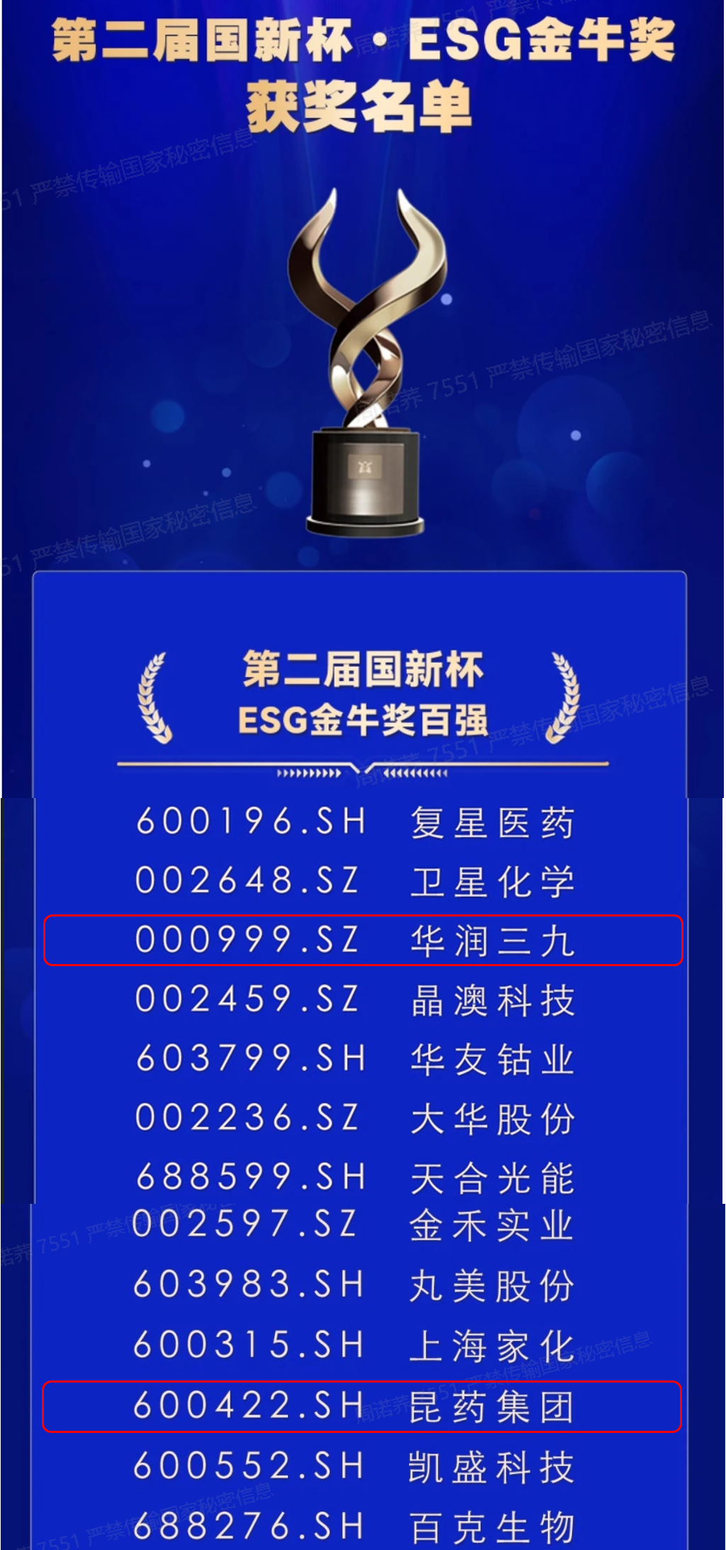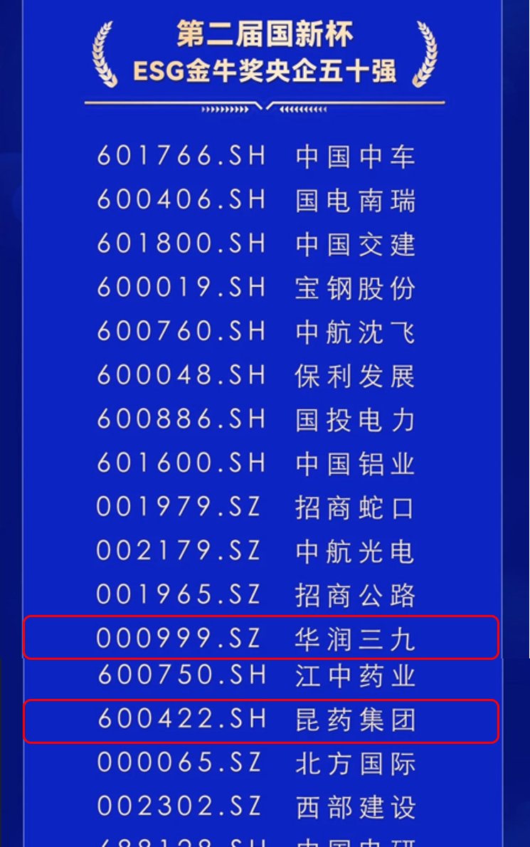近日,由中国证券报与中国国新控股有限责任公司联合主办的2024金牛企业可持续发展论坛暨第二届国新杯·ESG金牛奖颁奖典礼在上海举行。会上,第二届国新杯·ESG金牛奖榜单揭晓,太阳成集团tyc138及旗下昆药集团均荣获“ESG金牛奖百强”及“ESG金牛奖央企五十强”。