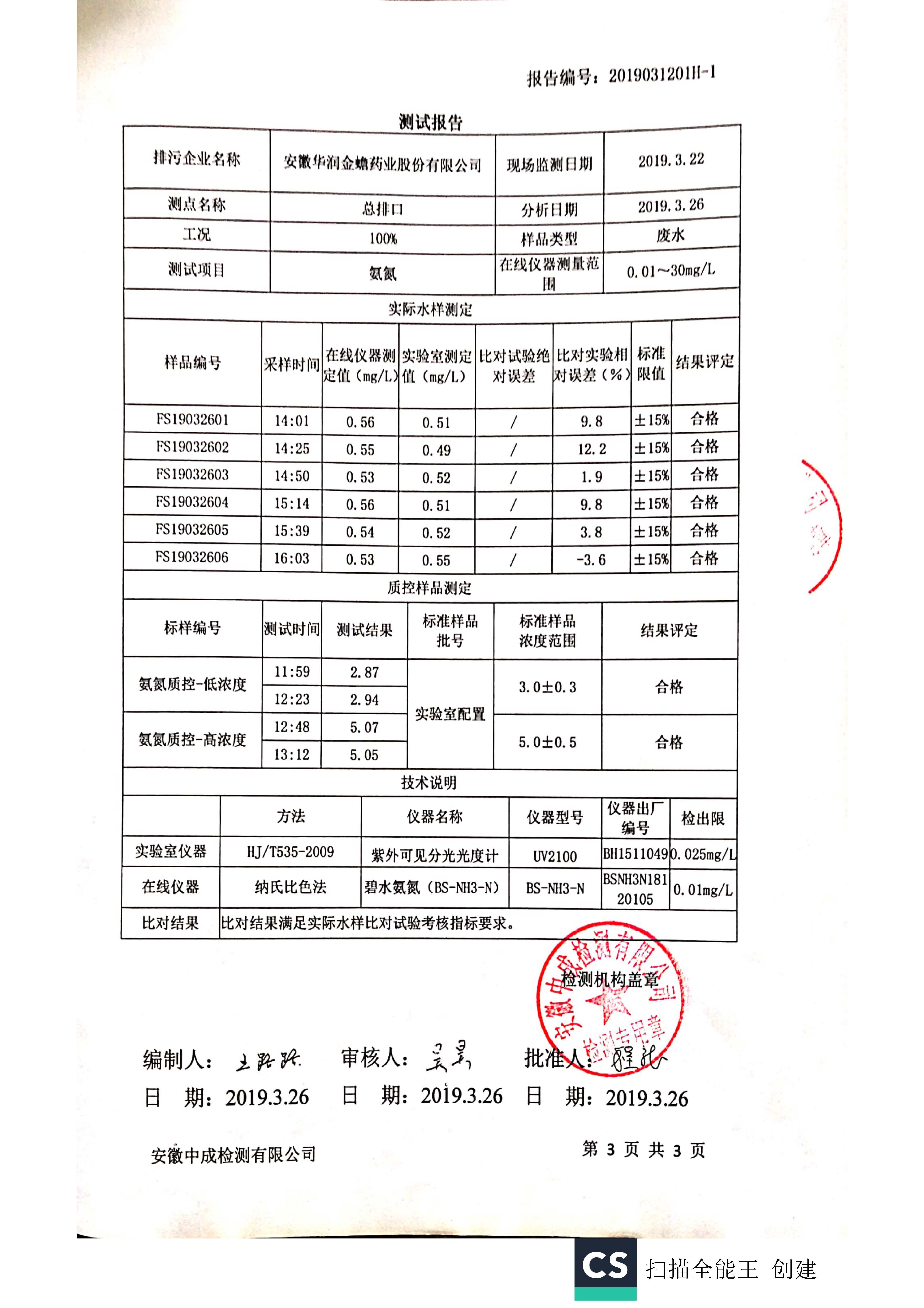 华润金蟾污染物排放检测报告(一季度)
