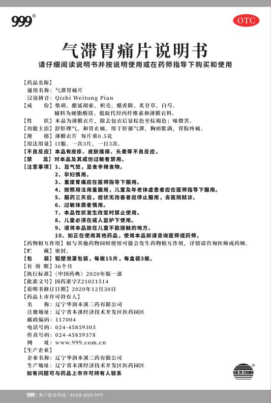 气滞胃痛片15片x3板