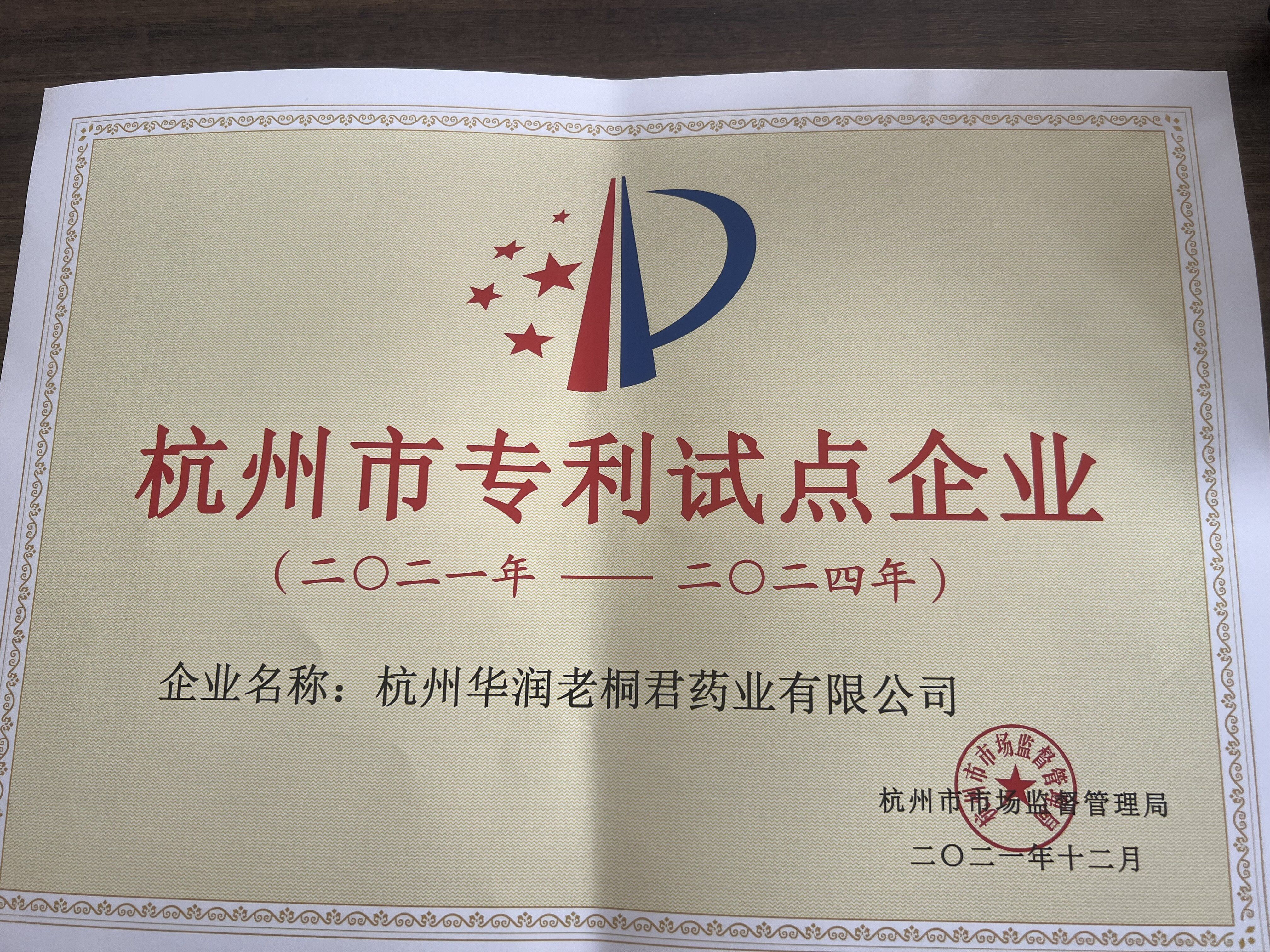 华润老桐君获评“杭州市专利试点企业”