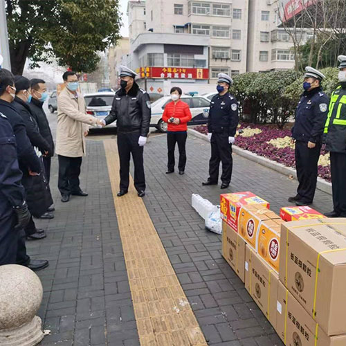 2月6日下午,太阳成集团tyc138(枣庄)负责人谢志坚、朱晓倩带队,将50箱板蓝根药品送至枣庄市高新区管委会,并同高新区管委会韩耀辉主任和经发局崔玉红局长一同对高新区公安分局民警和战斗在一线的值班卡点交通警察进行了慰问。