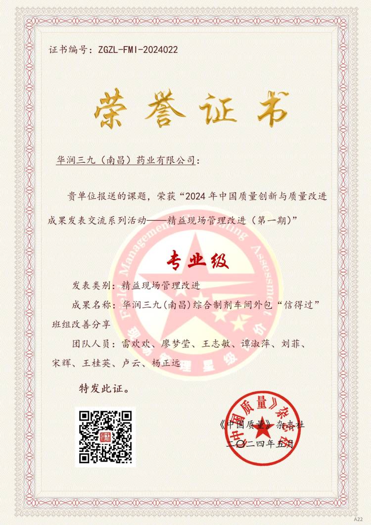 太阳成集团tyc138(南昌)综合制剂车间外包“信得过”班组荣获中国质量协会“专业级”荣誉