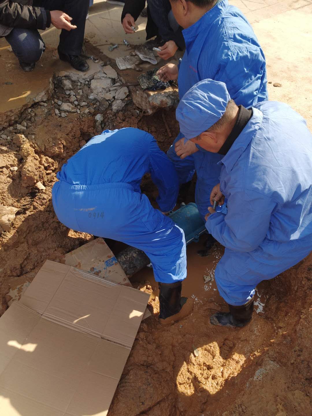 8点30分,挖掘机挖开混凝土,断成两部分的主水管暴露出来。抢修小组快速设置安全围栏后并进行抢修。关掉主阀后消防水管的水往主管道回流,导致破裂水管持续喷水,抢修工作变得极为困难。但抢修人员不惧严寒抢时间赶进度,利用抽水泵以最快的速度把哈夫节安装好。经过挖坑、排渍水、清淤、补漏、回填等抢修工作,下午一点经水压调试及时恢复了全公司供水,未影响正常生产运行。