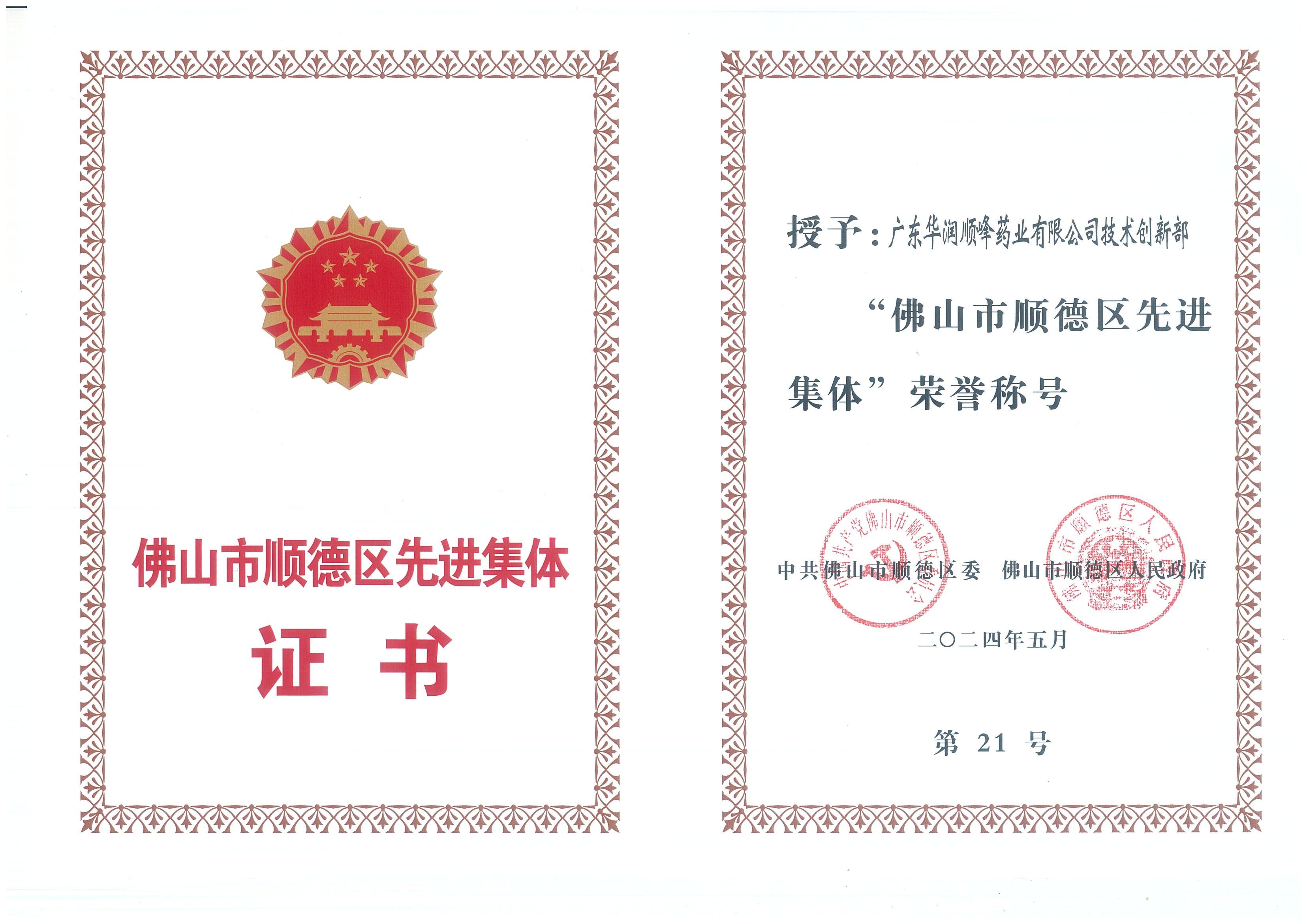 2024年5月28日下午,2023年佛山市顺德区劳动模范、先进劳动者和先进集体表彰大会在顺德区政府主楼四楼会议室隆重召开。为进一步弘扬劳模精神、劳动精神、工匠精神,奏响新时代奋斗者之歌,大会表彰20名顺德区劳动模范、40名先进劳动者和30个先进集体。其中,我司广东华润顺峰药业有限公司技术创新部凭借其卓越的贡献和成绩,荣获“佛山市顺德区先进集体”荣誉称号!