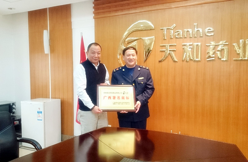 广西壮族自治区工商局近日下发《关于认定广西著名商标的通知》,桂林华润天和药业有限公司榜上有名,其“天和”及“伏波山”商标双双再度通过复审,被认定为广西著名商标。2016年2月2日,桂林市工商行政管理局刘副局长(右)一行前来公司颁发广西著名商标牌匾。